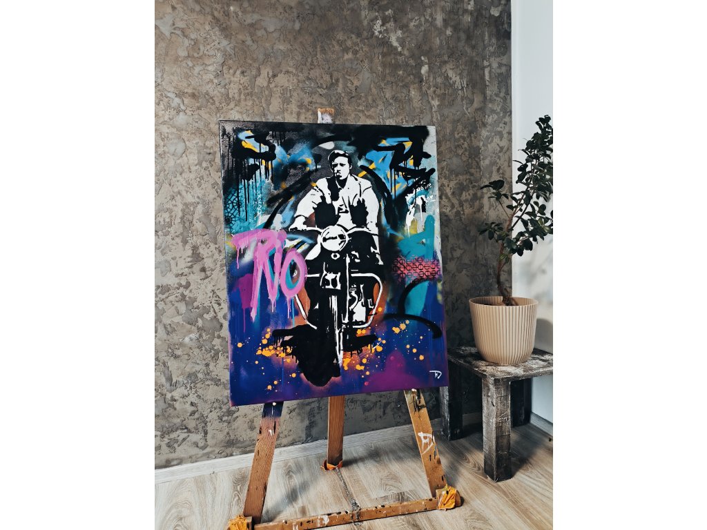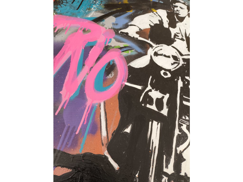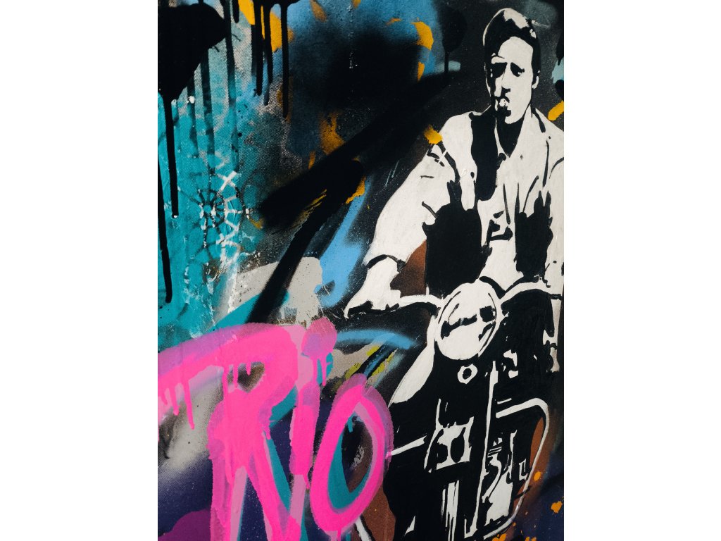 Toto dílo zachycuje esenci svobody a rebelství. Dominantní černobílá postava na motocyklu ostře kontrastuje s vrstveným pozadím plným neonově růžových, tyrkysových a fialových odstínů. Graffiti nápis „RIO“ a stříkané textury dodávají obrazu hloubku a pocit pohybu. Oranžové „splatter“ detaily ve spodní části pak celou kompozici uzemňují a dodávají jí dravost. Ideální kousek pro milovníky klasického Hollywoodu v moderním, dravém kabátě.