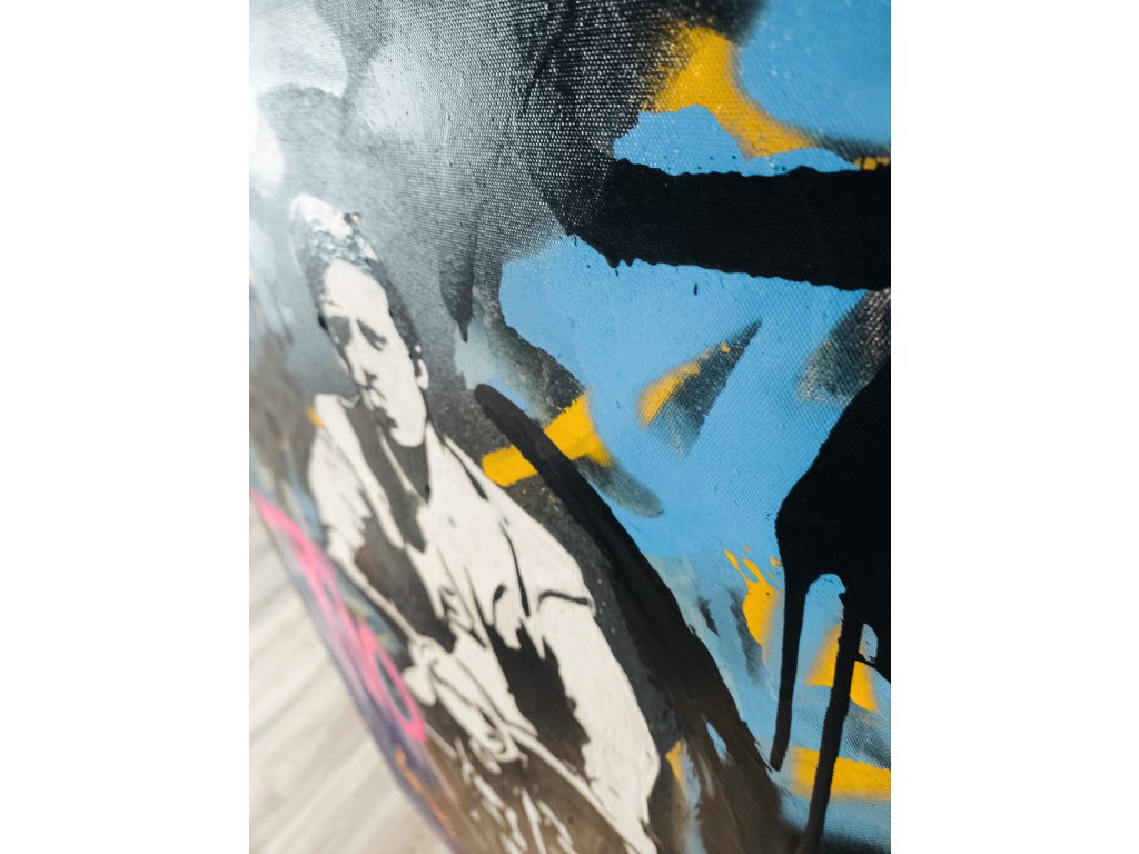 Syrový streetartový portrét Belmonda v nekompromisním černobílém stencillu, obklopený explozí neonových tagů a graffiti struktur. Velikost obrazu je 130 cm na 100 cm.