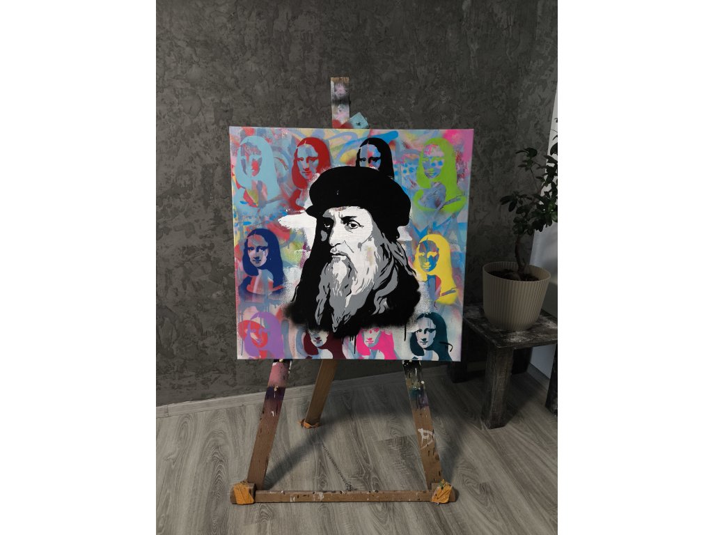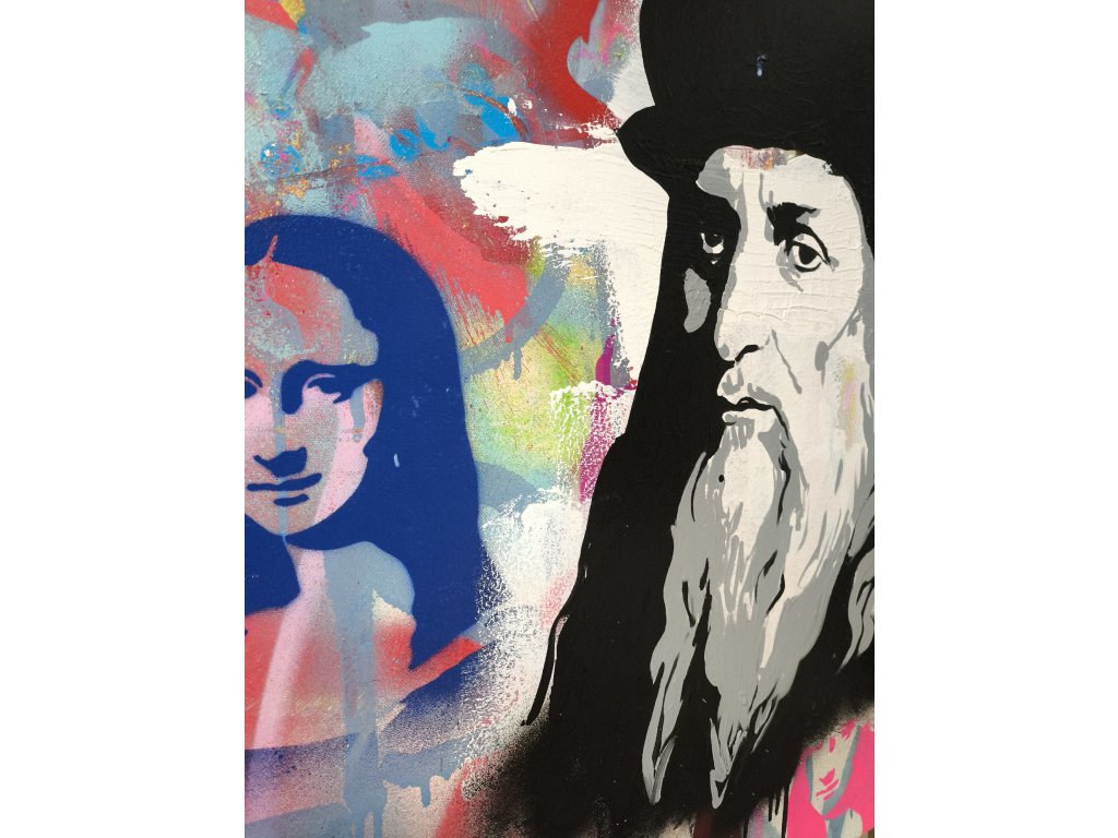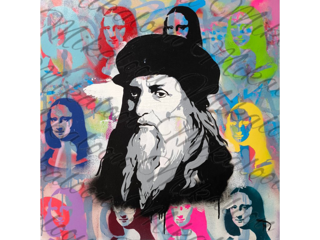 Ikonický portrét Leonarda da Vinci obklopený barevnými siluetami Mony Lisy v dravé a dynamické kompozici, která propojuje renesanční genialitu s energií současné ulice. Obraz je velký 80 cm na 80 cm.