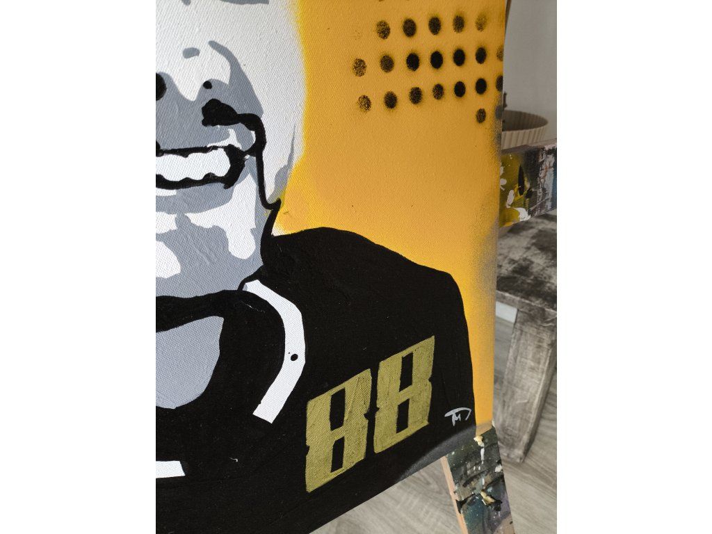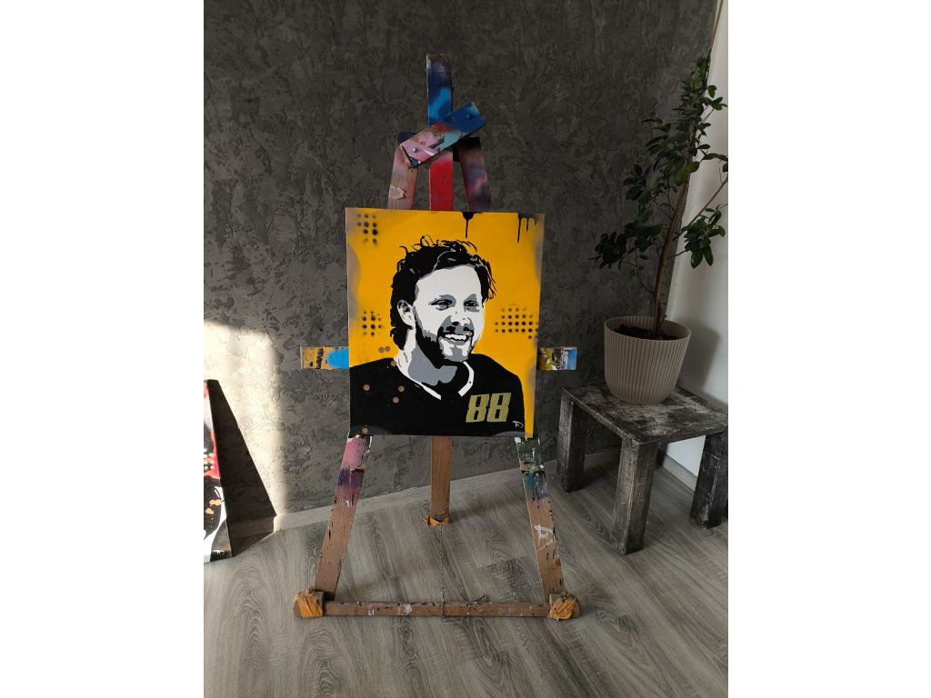 Tento dynamický velkoformátový obraz zachycuje jednu z nejzářivějších hvězd současného světového hokeje, Davida Pastrňáka, v jeho typicky pozitivní a energické náladě, která k němu neodmyslitelně patří. Ústředním prvkem díla je precizně vyvedený černobílý stencilový portrét usmívajícího se hokejisty, který věrně přenáší jeho bezprostřední charisma a radost ze hry přímo na plátno. Pozadí dominuje sytě oranžovo-žlutá barva, která vytváří vibrující kontrast s tmavou siluetou postavy a industriálními rastrovými vzory v podobě černých bodů. V dolním rohu jasně vystupuje zlatá číslice 88, Pastrňákovo ikonické číslo, zatímco celou kompozici doplňují černé stékající barvy a hnědé stříkance, které dílu dodávají autentický streetartový nádech a pocit nespoutané energie ulice. Toto dílo je moderní vizuální poctou sportovnímu talentu a dravosti a přináší vítěznou atmosféru do každého moderního interiéru nebo kanceláře sběratele.