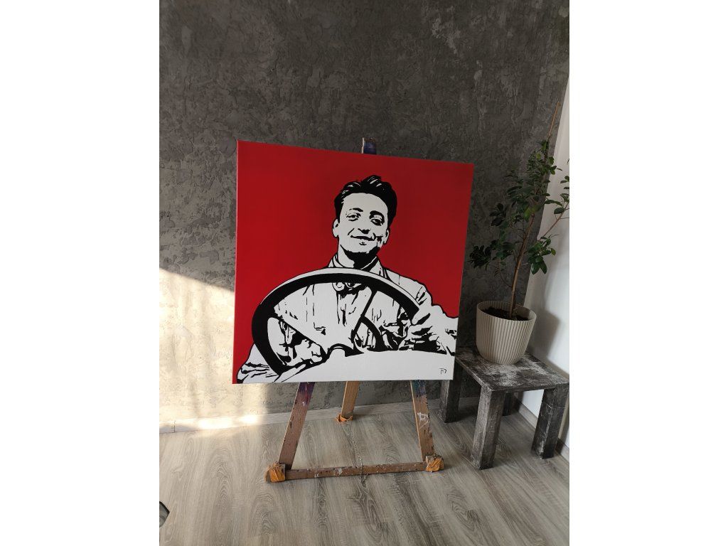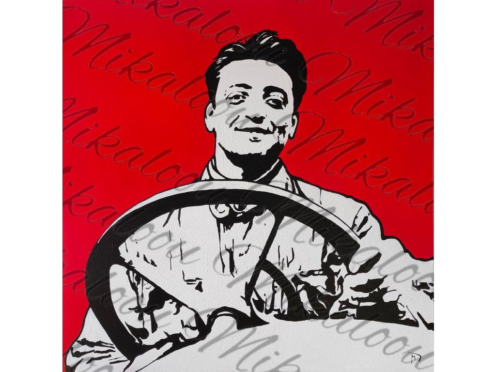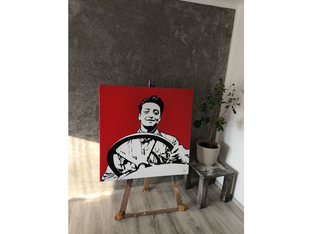 Tento velkoformátový obraz vzdává hold jedné z nejvlivnějších postav automobilové historie, Enzu Ferrarimu, v čistém a vysoce kontrastním provedení. Ústředním prvkem je precizně vyvedený černobílý portrét mladého Enza s lehkým úsměvem, který pevně svírá volant, což okamžitě evokuje éru hrdinských závodů a zrození legendy. Dominantou díla je sytě rudé pozadí v odstínu „Ferrari Red“, které plátnu dodává neuvěřitelnou energii a dává vyniknout ostrým liniím černé a bílé barvy. Celá kompozice je zbavena nadbytečných detailů a soustředí se na čistou emoci a sílu osobnosti, přičemž je v dolním rohu doplněna tvou charakteristickou signaturou. Toto dílo není jen portrétem, ale symbolem vítězství a nekompromisního designu, který se stane středobodem každé moderní pracovny, showroomu nebo interiéru milovníka rychlých vozů.