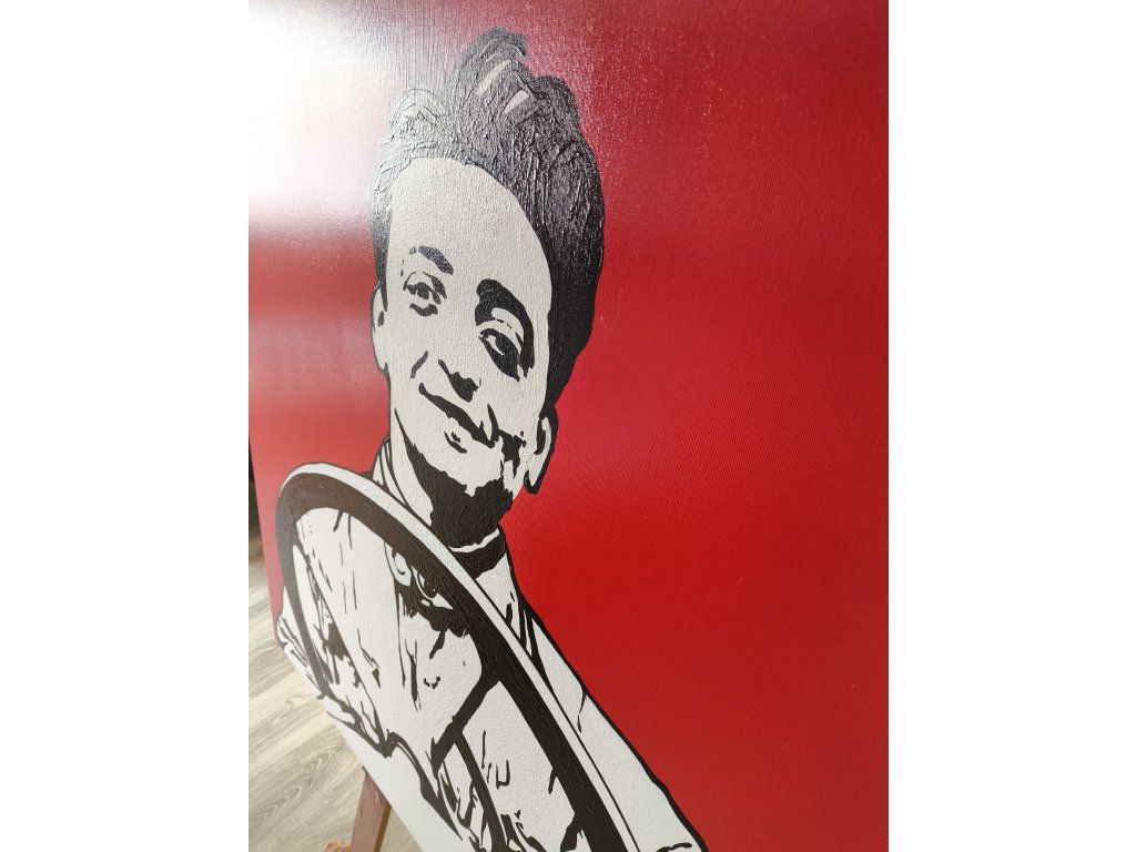Minimalistický a úderný portrét mladého Enza Ferrariho na sytě rudém pozadí, který zosobňuje rychlost, ambice a italský styl. Velikost obrazu je 100 cm na 100 cm.