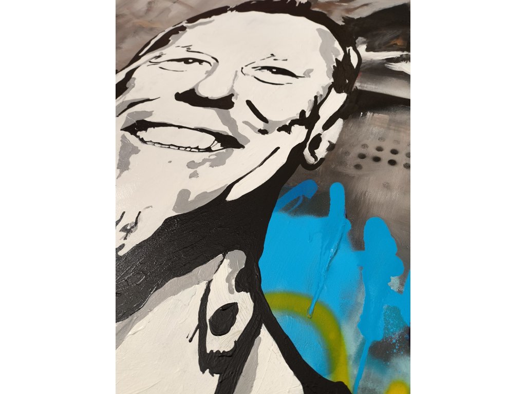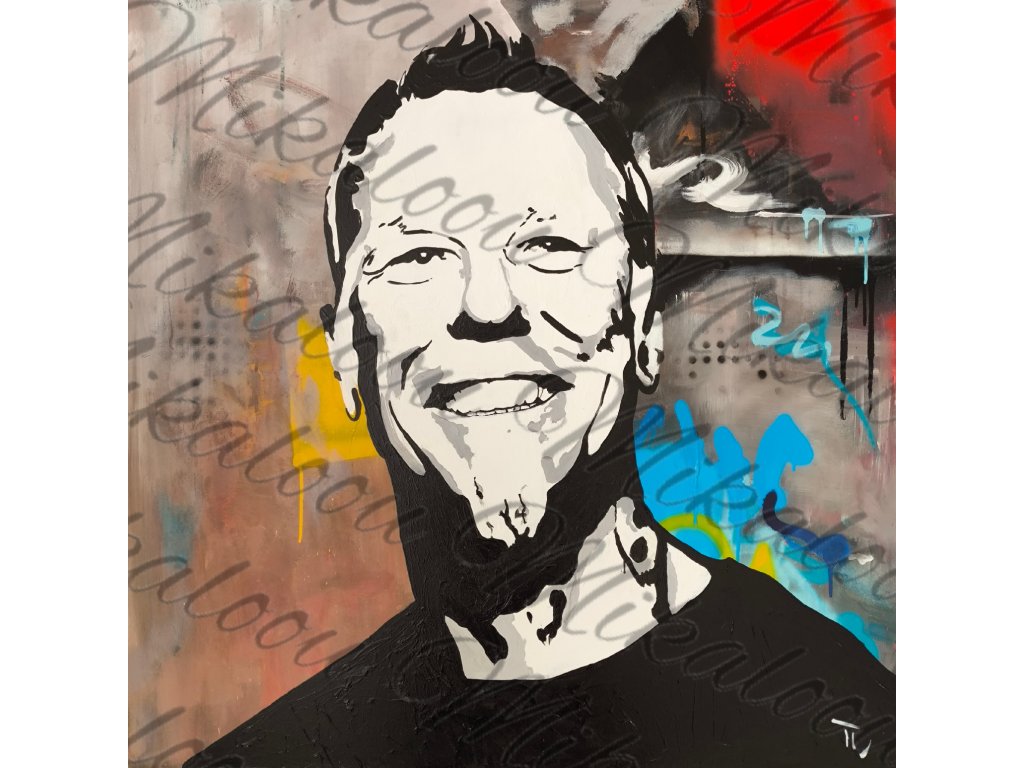 Výrazný černobílý portrét Jamese Hetfielda na dynamickém pozadí plném graffiti textur a neonových stříkanců. Velikost obrazu je 100 cm na 100 cm.