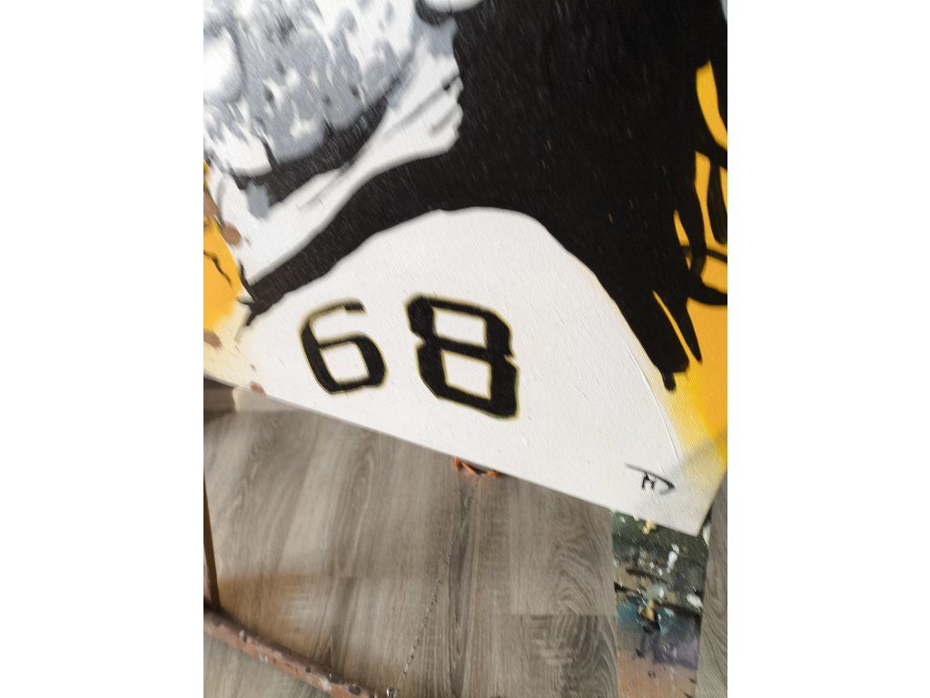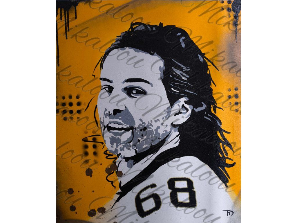 Tento zářivý velkoformátový obraz zachycuje absolutní legendu českého i světového hokeje, Jaromíra Jágra, v syrovém a energickém Pop-Artovém stylu. Ústředním prvkem díla je detailní černobílý stencilový portrét Jágra s jeho typickými dlouhými vlasy a strništěm, který věrně přenáší jeho nezlomného ducha a vášeň pro hru. Pozadí dominuje sytě žlutá barva, která vytváří silný vizuální kontrast s tmavou siluetou a černými šablonovými vzory industriálních bodů. V popředí jasně vystupuje ikonické číslo 68 na bílém dresu, zatímco celou kompozici oživují dynamické černé stékající barvy a hnědé stříkance, které dílu dodávají autentický městský a lehce rebelsky charakter. Toto umělecké dílo není jen poctou sportovní ikoně, ale moderním vizuálním prohlášením, které přenáší dynamickou energii stadionu a dravou sílu street artu přímo do každého moderního interiéru nebo kanceláře sběratele.