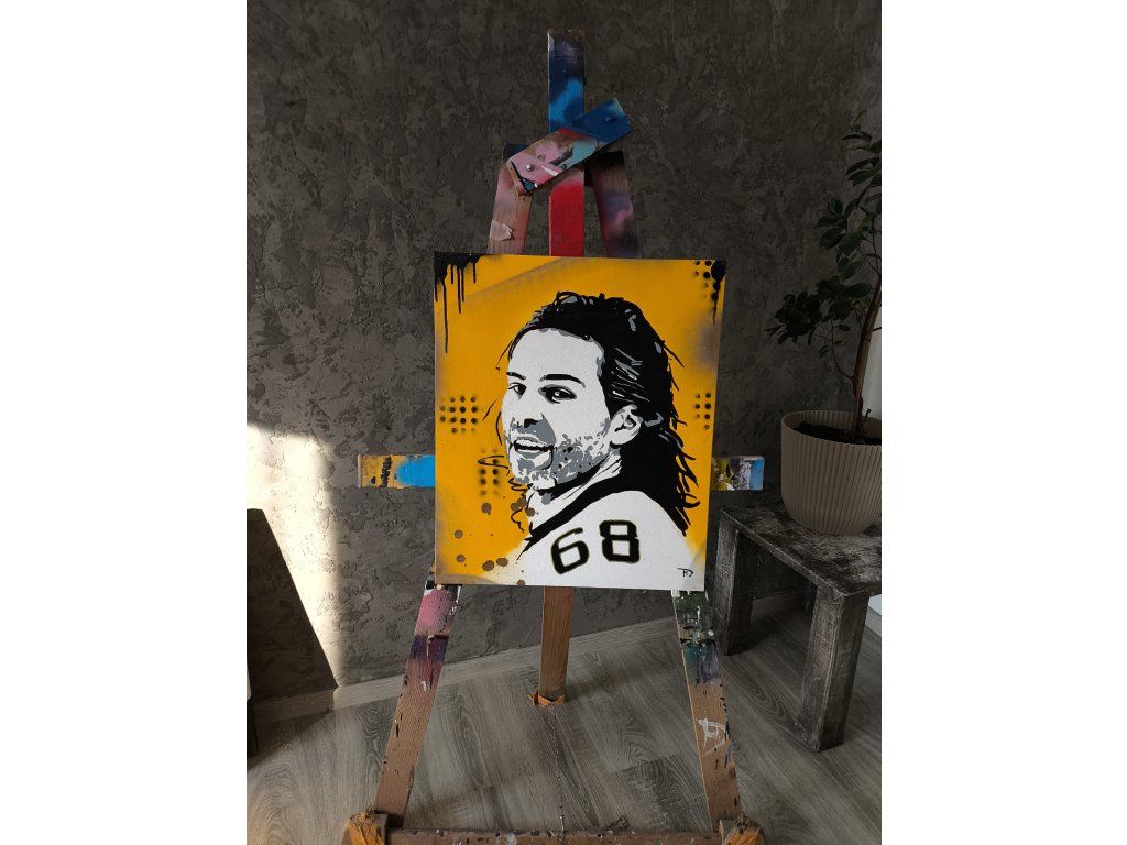 Ikonický portrét hokejové legendy Jaromíra Jágra na sytě žlutém pozadí s jeho legendárním číslem 68 a dravou streetartovou estetikou. Velikost obrazu je 60 cm na 50 cm.