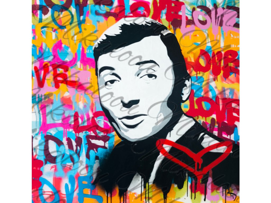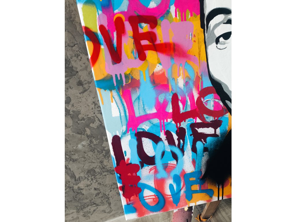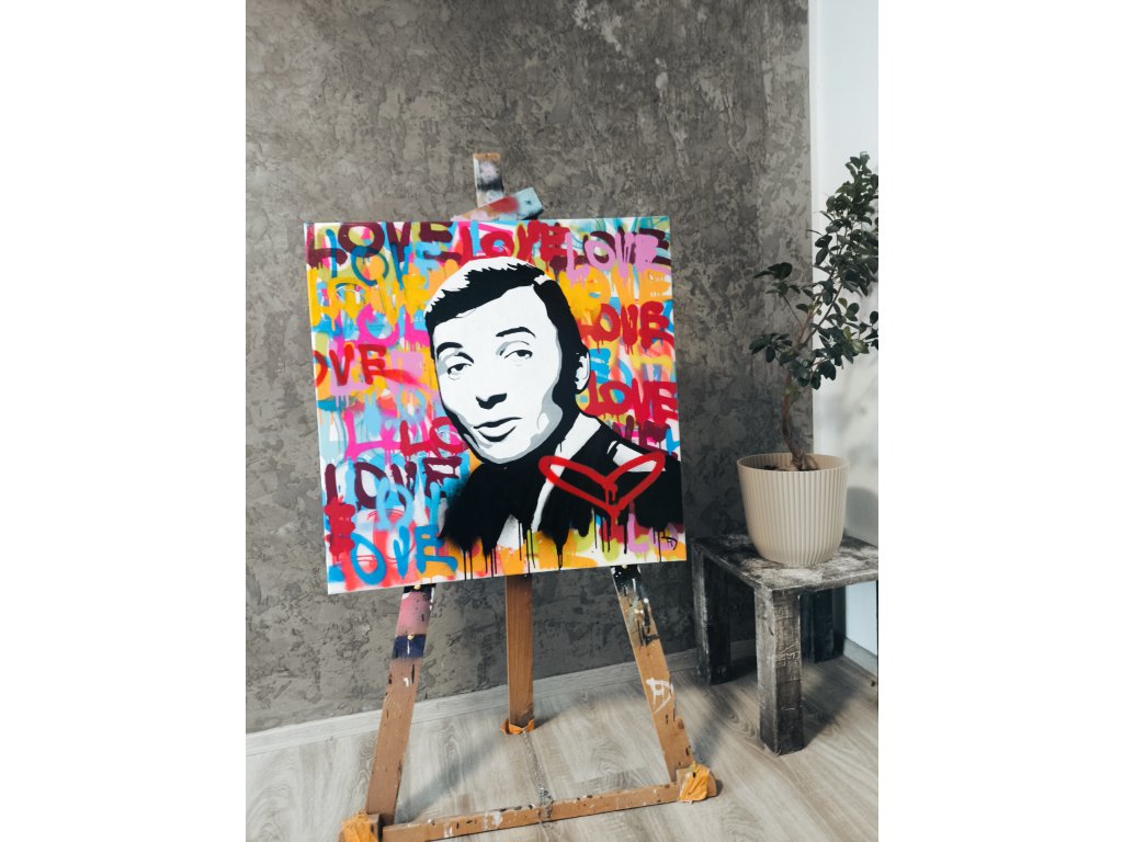 Ikonický portrét Karla Gotta v precizním černobílém provedení, obklopený barevnou smrští graffiti nápisů „LOVE“. Velikost obrazu je 80 cm na 80 cm.