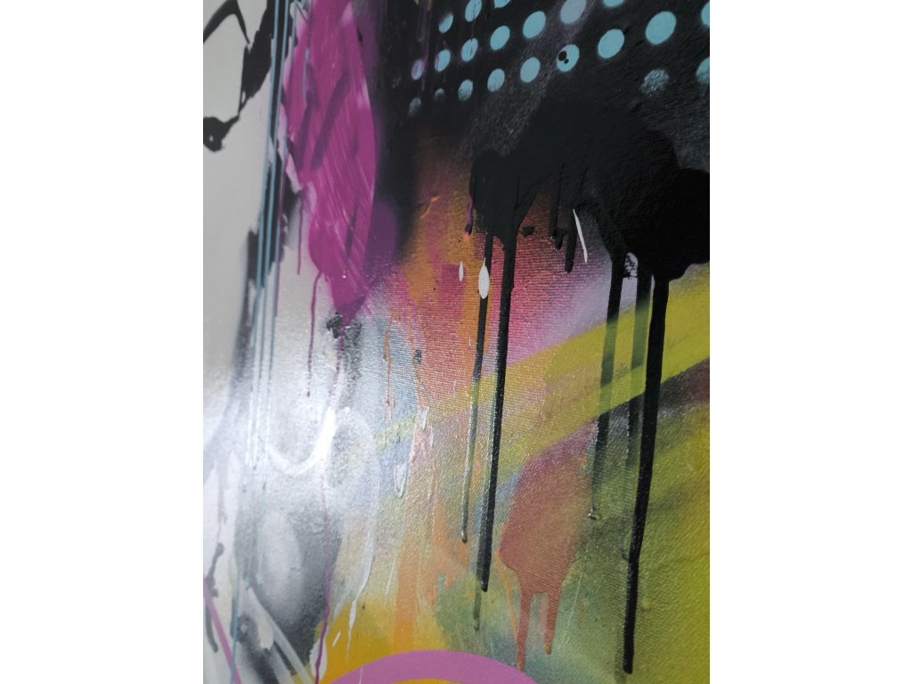 Tento velkoformátový obraz vzdává hold největší filmové legendě historie, Marilyn Monroe, v unikátním a dravém stylu Mikaloou, který proměňuje klasickou krásu v moderní umělecké prohlášení. Ústředním prvkem díla je precizně vyvedený černobílý stencil herčiny tváře, který zachycuje její uhrančivý výraz a smyslné rty, vystupující z bohatého a barevně intenzivního pozadí. Plátno je zaplaveno explozí neonově růžové barvy v horní části a sytými žlutými tóny ve spodní polovině, což vytváří silný vizuální kontrast a dodává dílu neuvěřitelnou hloubku. Celá kompozice je prolnuta autentickými streetartovými prvky, jako jsou tyrkysové stříkance, stékající barvy a abstraktní graffiti tahy, které v popředí doplňuje výrazné neonově růžové srdce, symbolizující vášeň i rebelství, které k této ikoně neodmyslitelně patří.