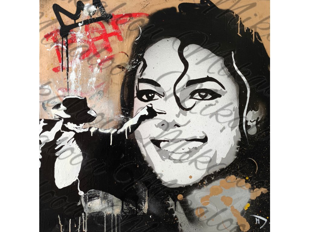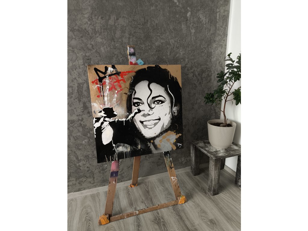 Ikonický portrét usměvavého Michaela Jacksona s výraznou graffiti korunou a surovými streetartovými detaily. Velikost obrazu je 80 cm na 80 cm.