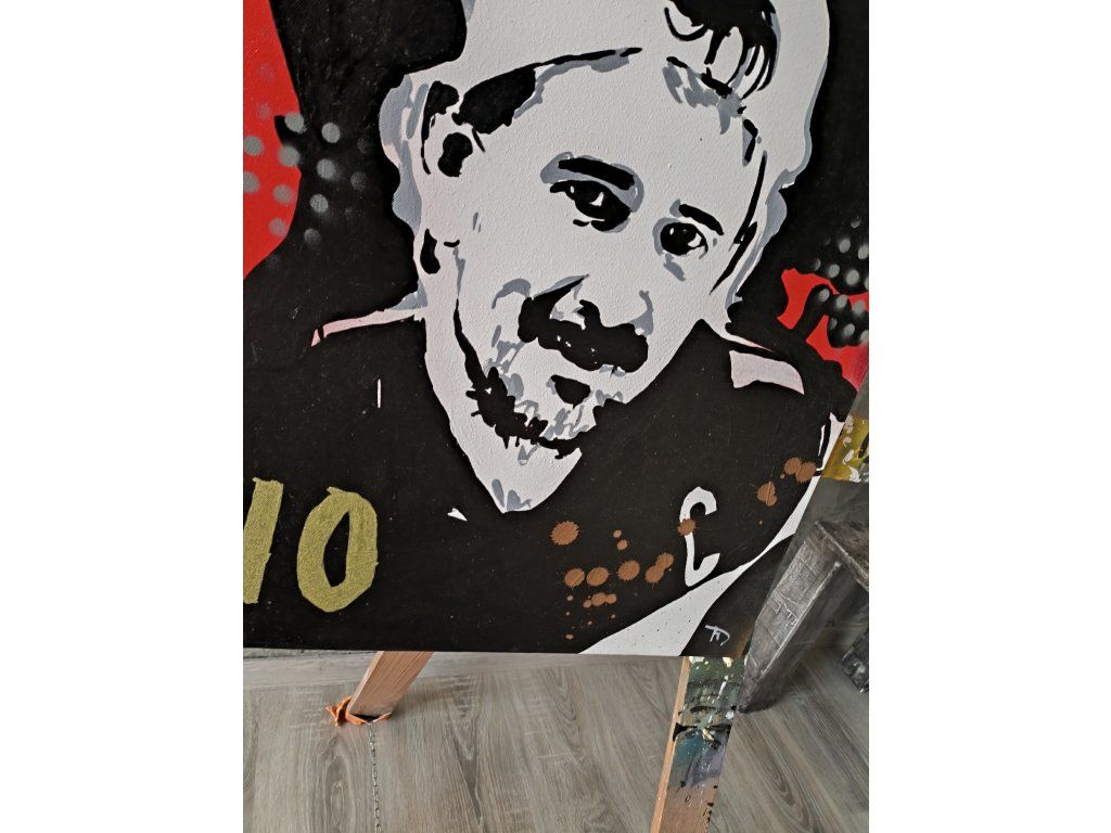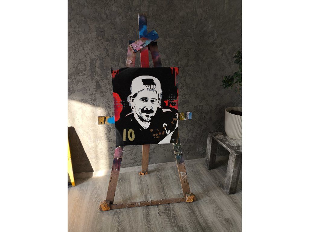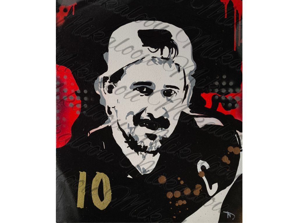 Surový streetartový portrét hokejového kapitána Romana Červenky, kterému dominuje zlatá číslice 10 a dravé rudo-černé pozadí. Velikost obrazu je 60 cm na 50 cm.