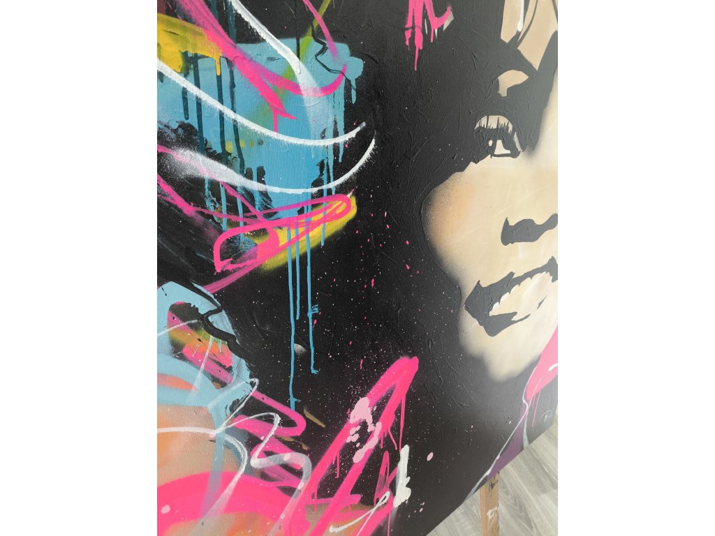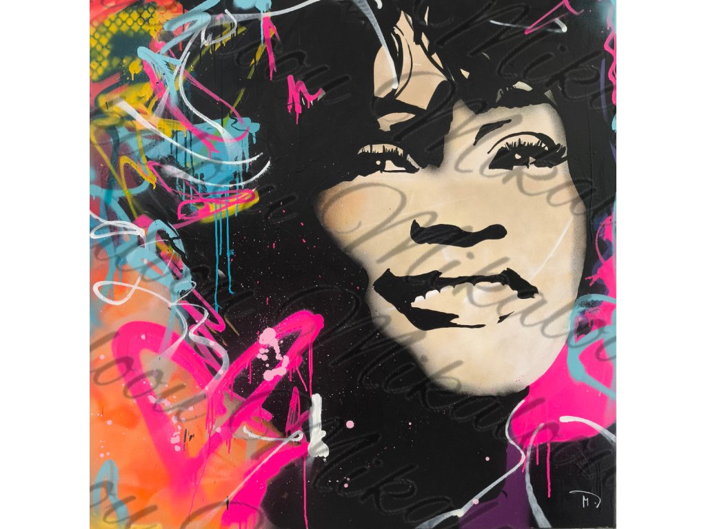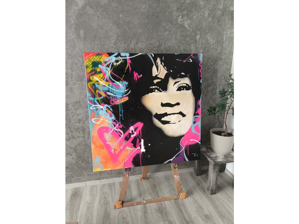Sytý a emotivní portrét Whitney Houston v kontrastu s divokými graffiti prvky a neonovými srdci, které doslova září z plátna. Obraz je veliký 120 cm na 120 cm.